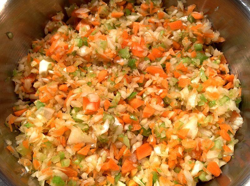 Put the onions, garlic, carrot and celery in a food processor and chop until fine and set aside. In a 6 to 8-quart, heavy-bottomed saucepan, cook the bacon until browned but not crisp. Remove the bacon and all but a table spoon of the bacon fat.  Add the onions, celery, carrot and garlic (the Sofrito) and sweat over medium heat until the vegetables are translucent and soft but not browned, about 10 to 15 minutes. If it starts to stick add some olive oil. Brown the beef and Italian sausage, pouring off any excess fat. Add to the sofritto along with the  bacon to the the vegetables.