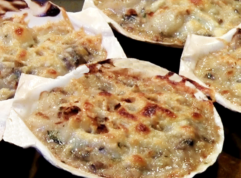 6. Broil the scallops until the mixture bubbles and the cheese melts and turns golden brown.